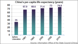 China life expectancyThe government says its investment in health care is paying off. Ninety-five percent of China's 1.3 billion people are covered by some form of health insurance, making it what the white paper said is the "world's largest network of basic medical security."